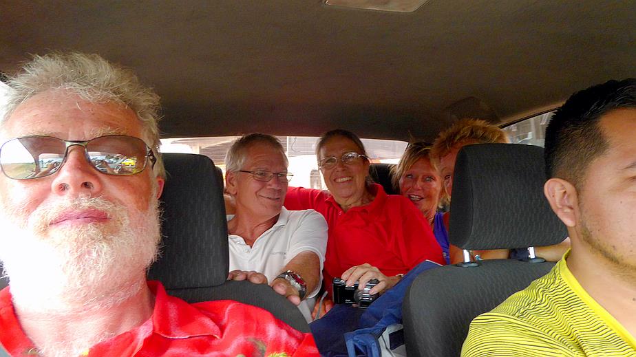 | Quelques moments de bonne rigolade lors du trajet pour se rendre aux écluses, dommage de prendre deux taxis alors qu'un seul, en se serrant bien, pourrait faire l'affaire... sitôt dit, sitôt fait ... à 6 dans une voiture... le chauffeur, 5 à l'arrière bien tassés, les plus petits forcement et Gilbert à l'avant ... ne pas faire cela en France, tous risqueraient d'aller faire un tour au commissariat et le pauvre chauffeur de perdre sa licence. |  |