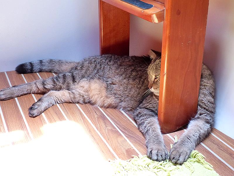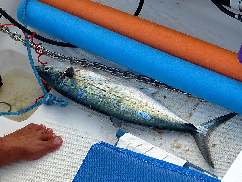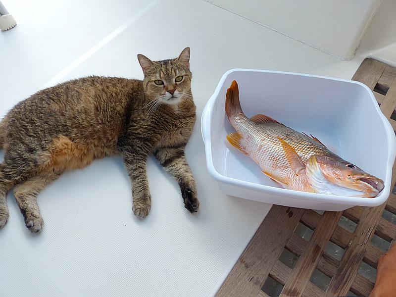 Notre copain Jean-Claude de Viking passionné de chasse sous-marine n'arrête pas de nous rapporter des pagres ou de grosses carangues, entre 3 et 5 kgs ... "poisson pour le chat" dit-il en déposant de magnifiques bestioles sur la jupe du bateau... Il adore chasser et son frigo est plein alors il nous gâte.... Flo se gave de poisson frais... Fait exceptionnel, elle est même descendue sur la seconde marche des jupes à l'arrière pendant que je préparais le poisson, elle adore venir chercher des petits bouts de tout frais bien choisi, Miss Courage "j'ai la trouille de tout" a surmonté sa trouille justement...C'est dire...
