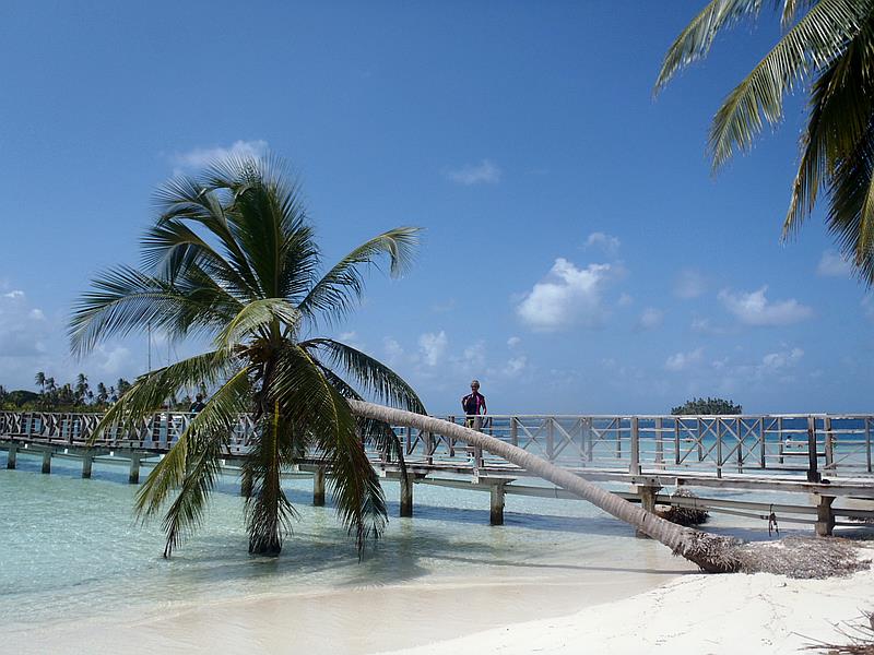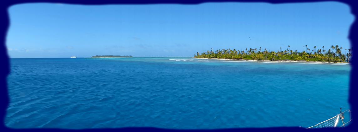 Tiadup, la première île en entrant dans la passe a bien changé elle aussi, une construction pas terrible sur le lagon bleu clair, c'est un resto pour "touristes" à la journée, des bungalows sur l'eau, avec des tuyaux d'évacuation des eaux noires peu discrets, un peu de béton, tout un secteur sur lequel les cocotiers ont été coupés pour faire place à un terrain de jeu, bonjour la chaleur sans l'ombre des arbres, le restant de l'île inondé de désherbant pour tenter de faire disparaître la végétation dans laquelle se plaisent les chicras, vous savez, ces bestioles volantes quasi invisibles qui vous dévorent à peine le pied posé à terre ! Déjà des bungalows avaient été construits à terre, mais ces insectes avaient eu raison du lieu. Pas sure que le nouvel établissement résiste à leurs quenottes gourmandes ! Cette fois les nouveaux bungalows sont sur pilotis côte au vent de l'île... peut être un peu plus de chance pour les clients d'être épargnés