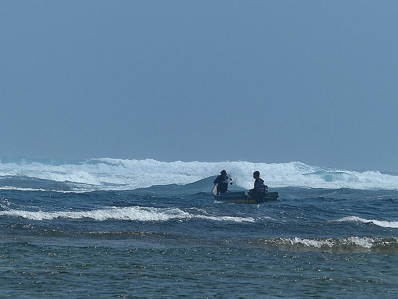 Grandes vagues sur la barrière de corail. Autres pêcheurs, autres techniques... Les indiens kunas ne semblent pas impressionnés et vont pêcher comme d'habitude, tranquilles dans le lagon à l'abri ou alors façon musclée dans les déferlantes.