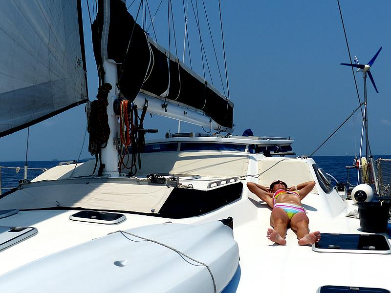 Nous avons eu des nuits totalement noires, peu d'étoiles le plus souvent car le ciel était assez nuageux et Madame la lune était en repos. Par contre nous avons eu quelques belles surprises avec la compagnie de dauphins quasi invisibles hormis leur trace grâce au plancton luminescent. Ils filaient le long des coques de Chamicha, se croisaient, repassaient, bref des moments magiques malgré la noirceur de la nuit.