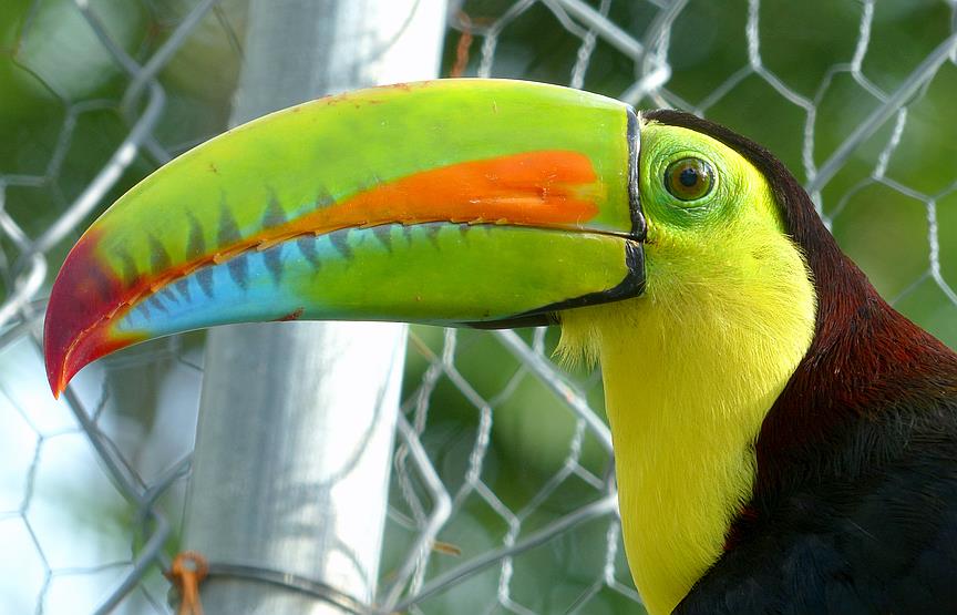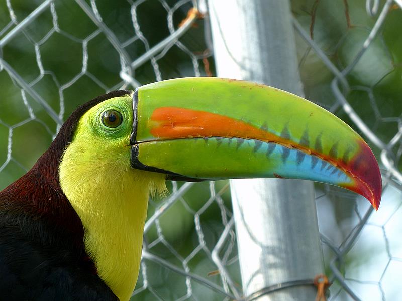 aussi un joli toucan avec une aile cassée, il est dans une belle cage chez Sylvie et Jean Paul à la marina. On dirait que son bec est peint avec un pinceau magique par Dame Nature. En sa compagnie un petit perroquet à l'oeil malicieux.