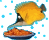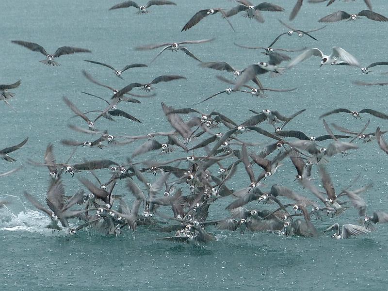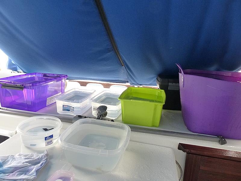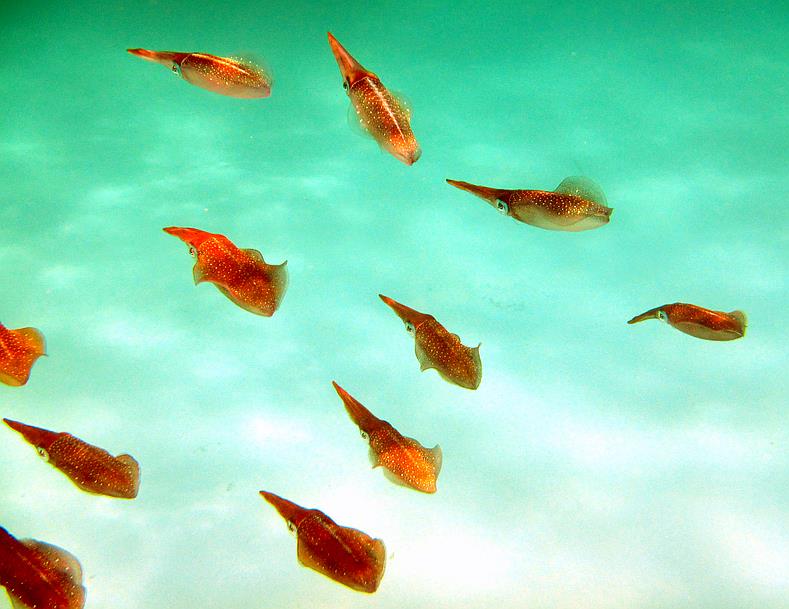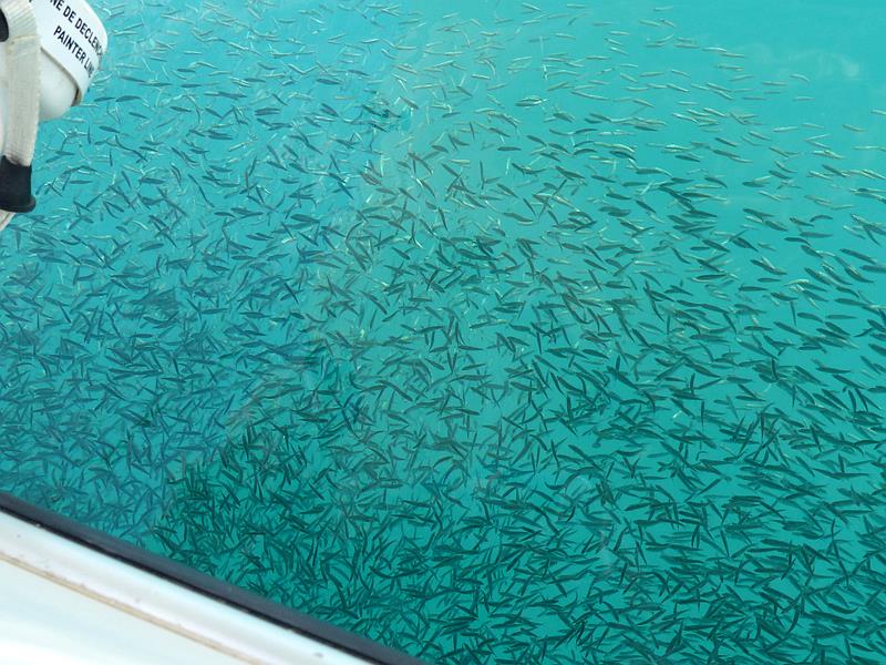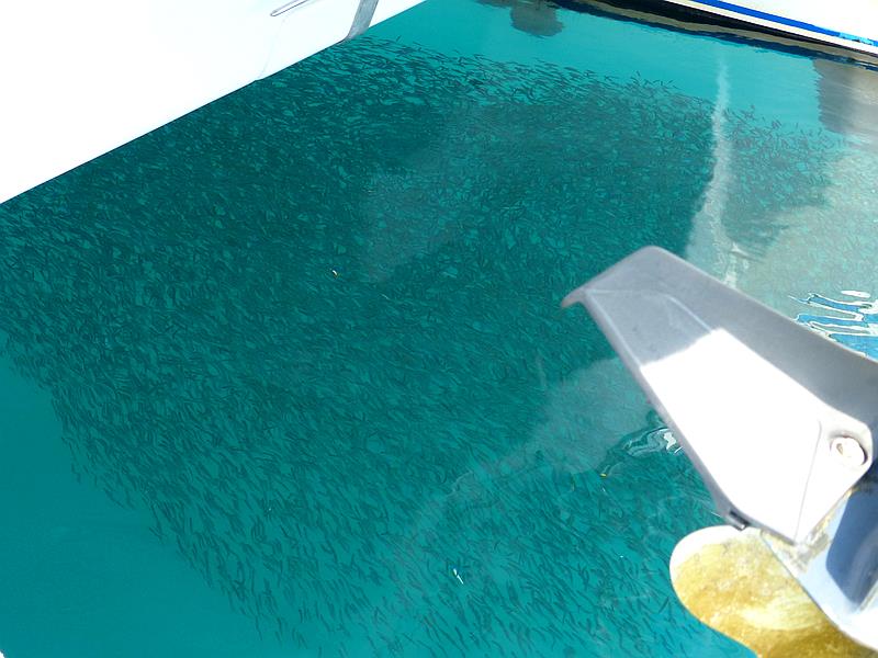 | Sous le bateau, une foison de minuscules poissons qui viennent de naître, des légèrement plus grands, on en a de toutes les tailles mais aussi plein de carangues qui les chassent, ça bouge de partout.... Il y a de la vie sous les coques... Quelques jours plus tard, 21 calamars trouveront aussi la planque agréable et n'iront pas chercher refuge ailleurs. Ils changent de couleur perpétuellement.