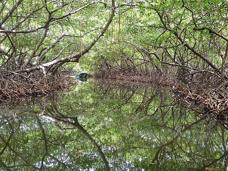 En allant à Panamarina, là où se trouve notre ancien bateau, tunnel sous la mangrove. Un vrai miroir quand l'eau est calme, très bucolique. Ici cet endroit est appelé " le tunnel des amoureux" |