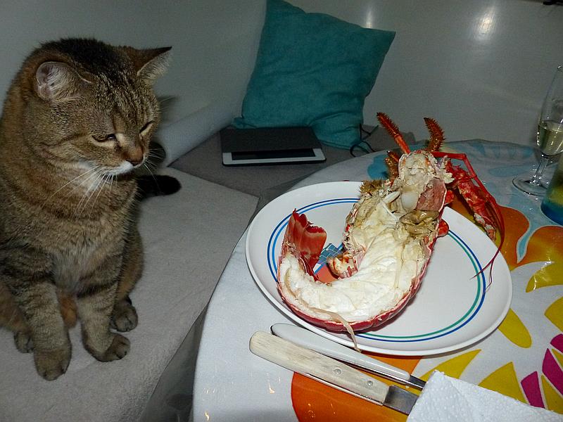 Encore notre gros minet qui profite de la gentillesse de Monique ... Elle lui sert tous les matins son "lait quotidien" et ses "noisettes de beurre", et parfois selon le menu du jour Gilbert lui donne un peu de sa gourmandise préférée, de la langouste ! mais je vous rassure, ce n'est pas Noël tous les jours !
