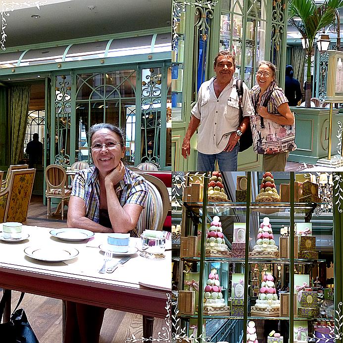 On a testé aussi par hasard ce salon de thé.... dans un centre commercial où l'on trouve du Dior, du Cartier, du Rolex, du Burberry, du Prada.... et j'en passe ... nous, on ne faisait que le traverser pour changer de rue... on n'a rien acheté mais en cours de chemin nous avons trouvé ce fameux salon de thé parisien "LADUREE" implanté dans les grandes villes hyper touristiques du monde entier.... la petite pièce 7,8 dollars.... on en a pris 2 pour 3 et on a partagé...des fois qu'elles n'auraient pas été à la hauteur de nos espérances ! avec un café chacun... 35 dollars... une paille !!! Si d'aventure vous allez à Paris, voici le lien pour vous mettre l'eau à la bouche et vous indiquer l'adresse... ça vaut le déplacement, mais je vous rassure... pas tous les jours... le porte-monnaie va faire triste mine !