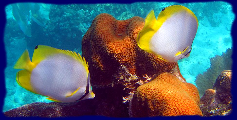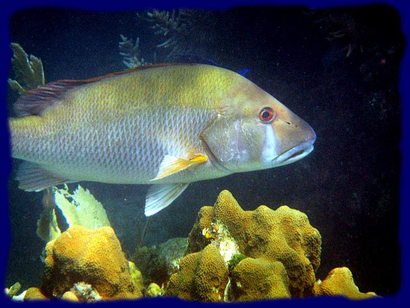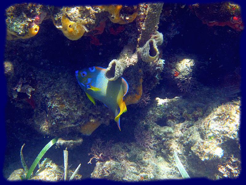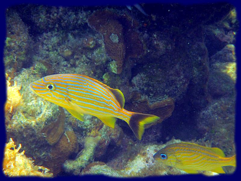 Poissons tropicaux aux couleurs éclatantes, mais également des barracudas, des carangues à gros yeux, ainsi que des vivaneaux à queue jaune, de très gros pagres, des raies léopards, des raies mantas aussi parait-il ... pas vu... des murènes, bref, toute une vie qui est est maintenant un peu coutumière mais toujours agréable à découvrir.
