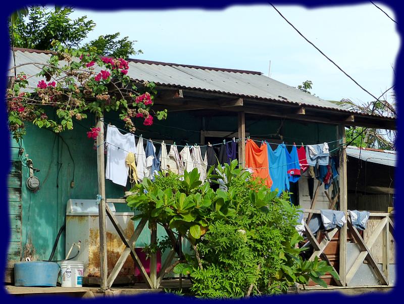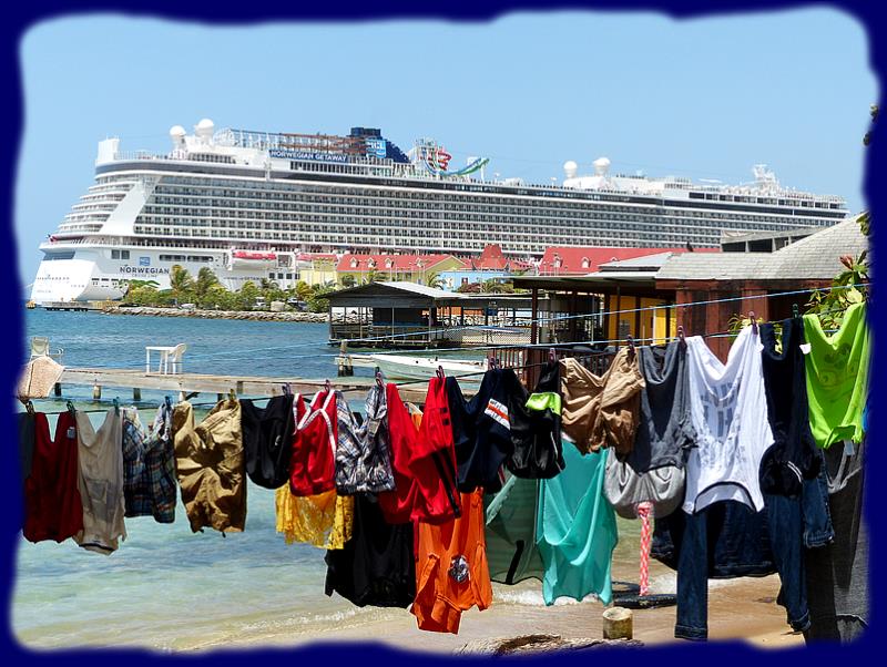 | | Au détour du chemin à Coxen Hole ... contraste saisissant entre le linge qui sèche et l'arrière plan ... le Norwegian Getaway ... |  |