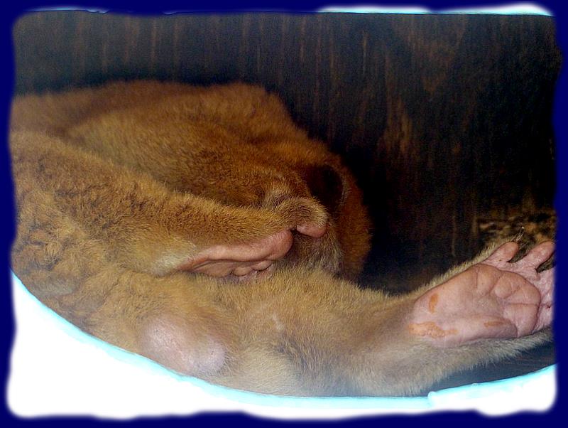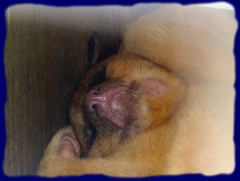 |  | Et puis, juste à coté, un petit animal rouquin qui n'a pas voulu montrer le bout de son nez, il dormait papattes en rond dans sa maison. En fait, il s'agit d'un "kinkajou", ou encore appelé "ours de sucre". Et s'il dormait, c'était normal, il vit la nuit... et paraît-il celui-ci est bien actif quand il est l'heure de sortir son museau à la tombée du jour ...