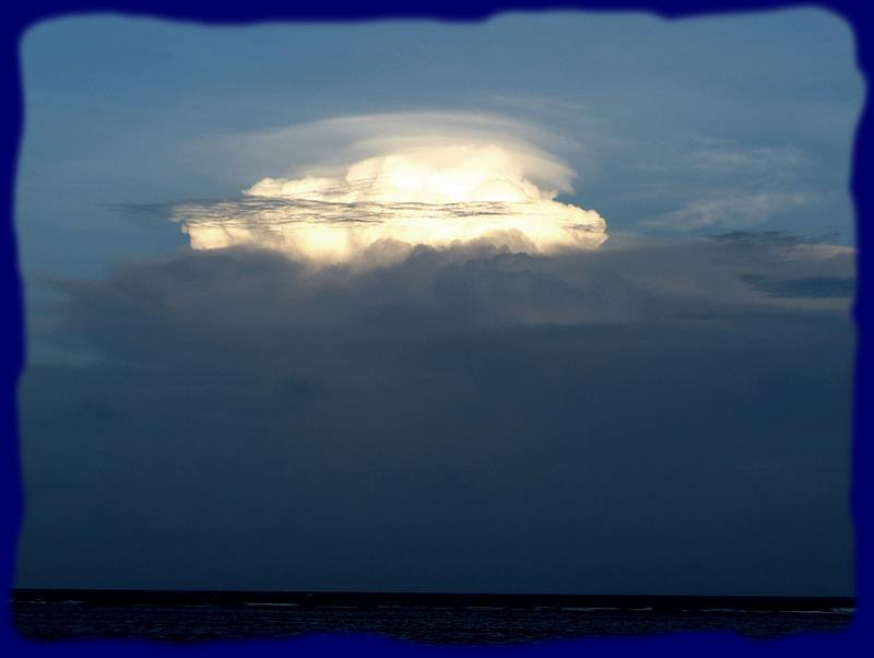 Reflet du coucher de soleil dans les nuages sur la côte du Honduras depuis une terrasse...(ce n'est pas Chamicha) Peu de temps après, ce seront les éclairs sur le continent qui illumineront le ciel ... |