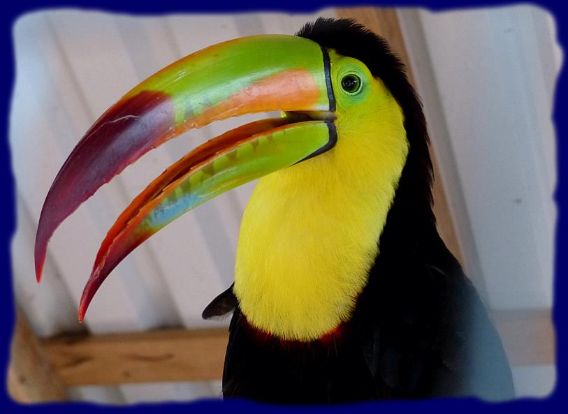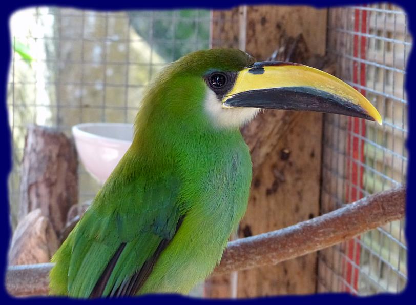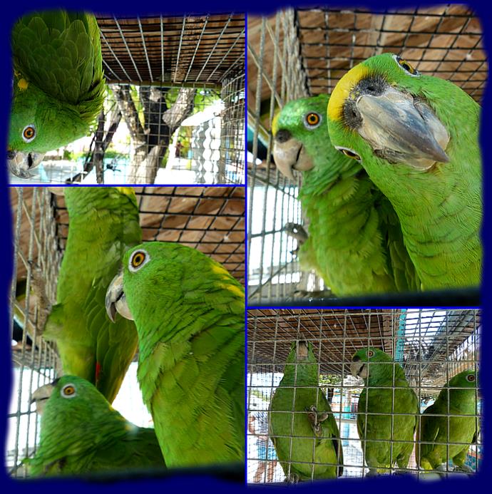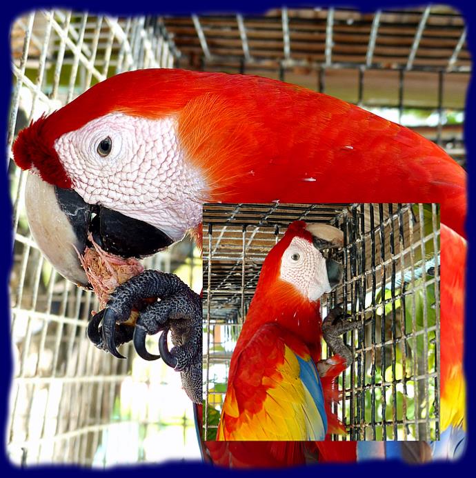 |  Quelques perroquets colorés et un magnifique ara dans de grandes cages.