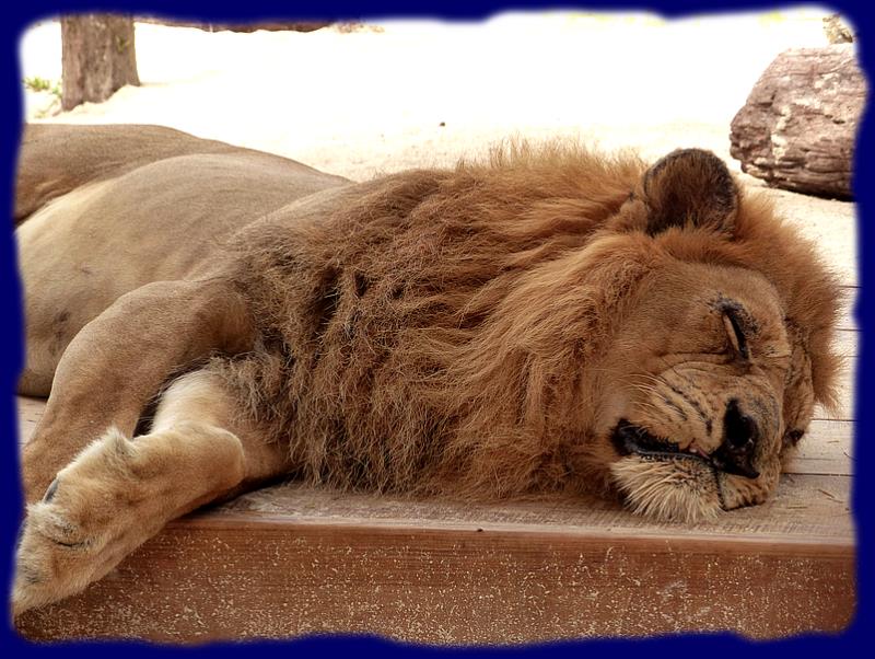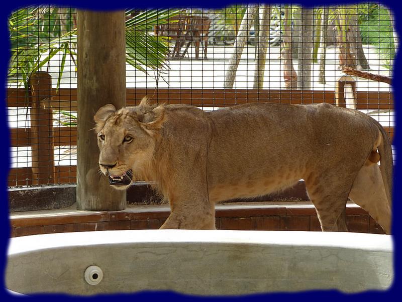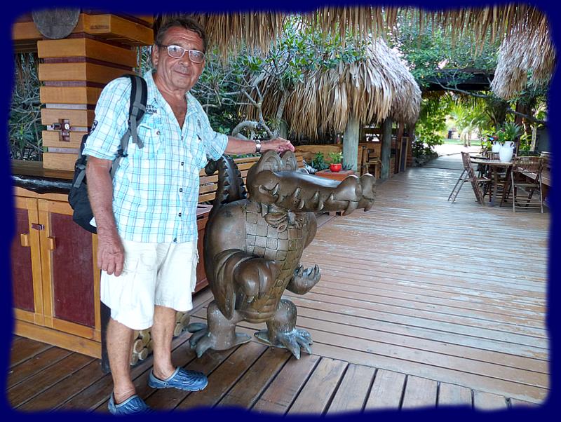 C'est un petit parc de loisirs, situé à 2 pas du bateau, que les visiteurs accèdent en radeau à moteur. Bar, resto, piscine naturelle dans le lagon, mais aussi un petit zoo où nous avons fait la connaissance de Lawrence ... devinez, un superbe lion qui a passé une bonne partie de son existence dans une cage à peine plus longue que lui, dans un zoo ou un cirque. Il a été récupéré en piteux état, remis sur pied, soigné et enfin nourrit correctement. Il vit ici maintenant une belle retraite dans une immense cage sur cette petite île.