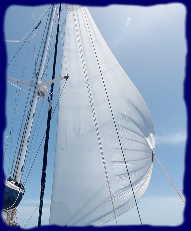 La photo prise peu de temps avant la trempette !!! Elle est belle cette voile et nous permet de bien avancer. Nous n'avons pas encore testé notre spi, affaire à suivre, mais lui est dans une "chaussette", peut-être que la manoeuvre sera plus aisée pour le ranger. |