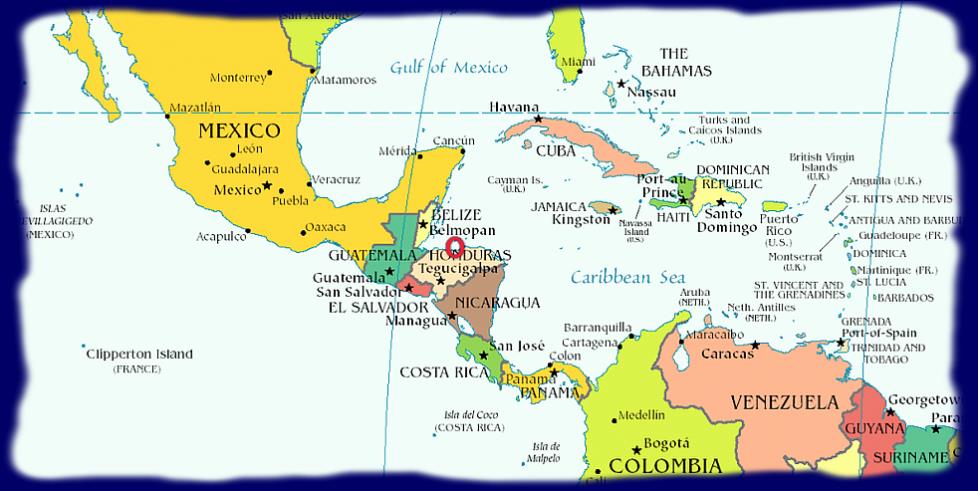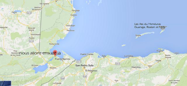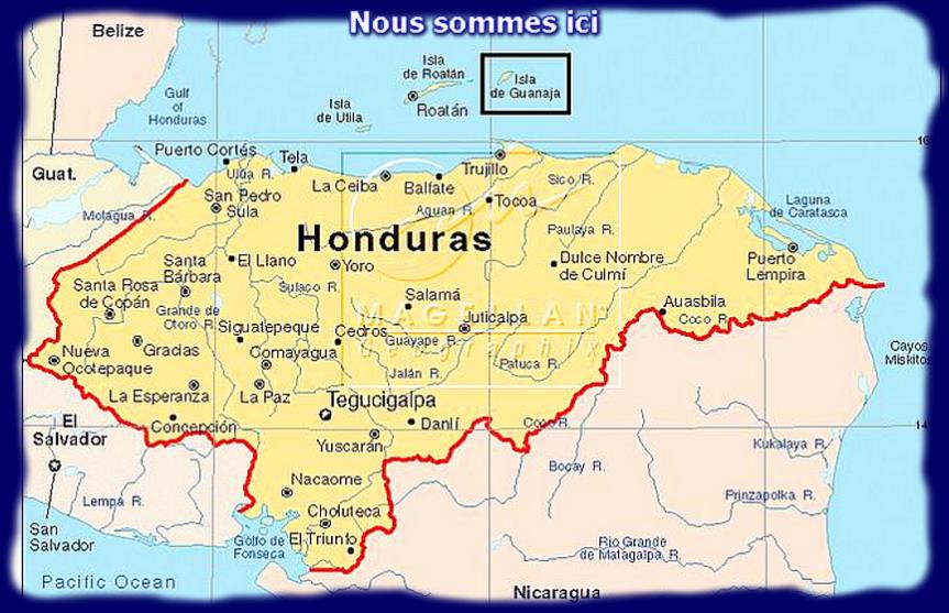 |  Premier stop, l'île de Guanaja ... |  | Nous sommes par là, sur l'île, quelque part sous le "O" rouge au nord du Honduras.