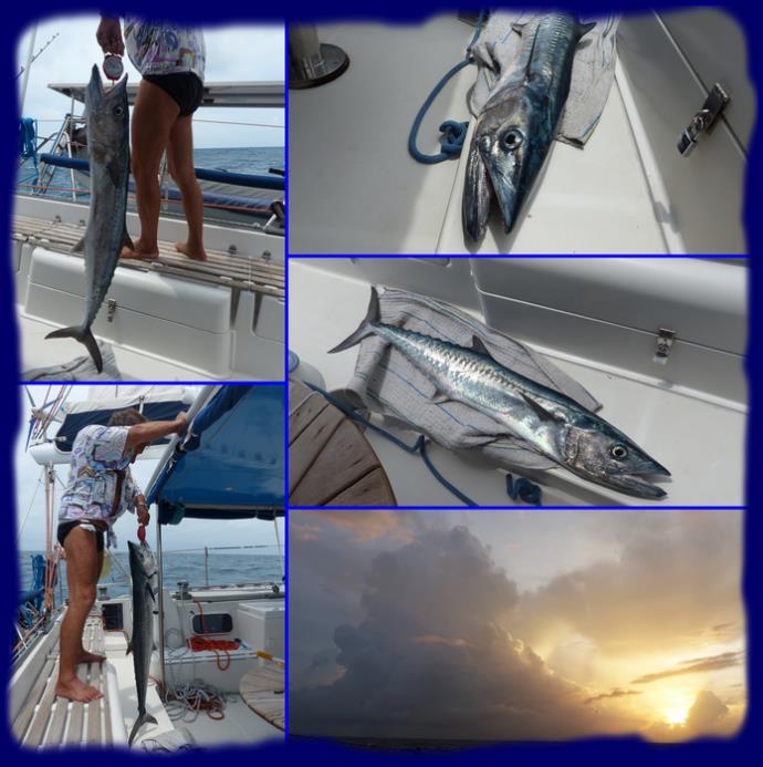 | Enfin nous avons quand même dans notre mouillage Compère "barracuda" format plus que correct, disons 1m - 1m20 en position "chasse" sous nos coques depuis quelques jours, un petit dauphin qui a pointé le bout de son rostre à quelques mètres à tribord et une magnifique raie léopard qui a fait un superbe saut juste derrière nous. On ne peut pas tout avoir !!!