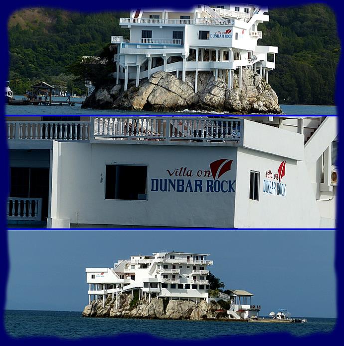 | | L'hôtel super classe DUNBAR Rock, construit sur un rocher qui semble trop petit, est juste à coté de notre mouillage