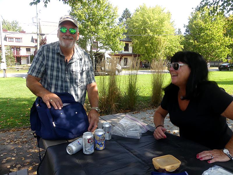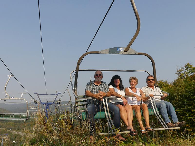 Entre temps on est allé voir des amis de bateaux France et Guy dans les Laurentides, un peu au nord de Montréal. Le pont culminant est à 969 m, plein de collines et de jolis lacs au alentour, avec une ville hyper touristique, au pied du mont Tremblant, un peu façon Mickey, plein de monde le week-end. On part du village en télécabine pour monter au sommet, ça fait un peu fainéant mais vu la forme...