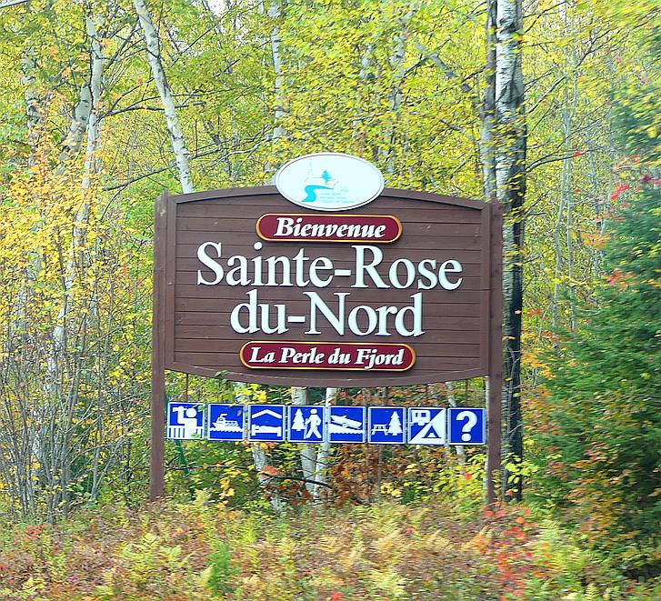 Donc nous avons quitté Tadussac et ses baleines absentes et sommes remontés le long du fjord mais en fait, pas beaucoup de vue sur ce dernier, on a longé une petite rivière, la Ste Catherine, nous avons vu plein de forêts aux belles couleurs d'automne, quand on dit que les chats ne voient pas les couleurs, baliverne, je vous assure que c'était très beau. 60 kms en gros pour arriver à ce qu'ils appellent ici la « perle du fjord », Sainte Rose du Nord ou auparavant mystérieusement l'anse du Manitou… tout un programme. Les 450 habitants s'appellent des « roserains ». Au point d'information du petit village, une gentille dame leur a indiqué un camping, on y est resté 2 jours. Sauf que, et bien, il ne faisait pas un temps à mettre un chat dehors… il a plus toute la soirée et une bonne partie de la matinée. Ils ont mis l'extension pour avoir plus de place et jouer aux grands mais au moment de partir il a fallu virer toutes les feuilles et l'eau qui étaient stockés sur le store qui l'a protège... Il a pas entendu quand elle lui a dit qu'elle devait passer à côté, elle a pris une douche frisquette ! bbbrrrrr…