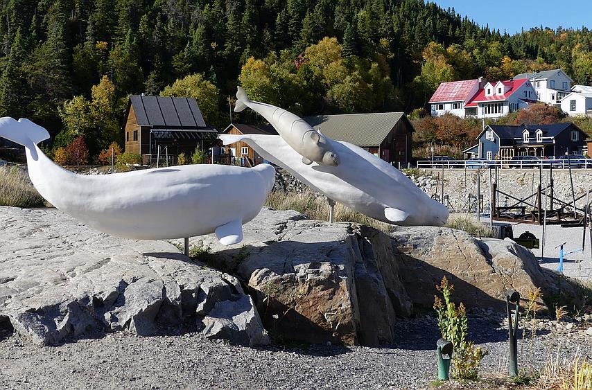 Nous voici donc à Tadussac, mignon petit village très très touristique situé à l'embouchure du Fjord du Saguenay, la rivière qui descend du lac St Jean et qui se jette dans le St Laurent. Nous sommes donc enfin dans le grand parc marin du Canada, endroit unique au monde. Semble-t-il le plus grand fjord du monde aussi. Ici c'est le garde-manger des gros mammifères marins, des baleines, qui arrivent aux environs du mois de Mai avant de repartir en octobre vers d'autres contrées pour se reproduire. Pour ne citer que quelqu'uns de ces monstres : rorqual bleu, rorqual commun, rorqual à bosses, petit rorqual, marsouin, bélugas, et bien d'autres encore. On peut partir en bateau pour les voir de plus près, mais nous au bateau, des fois, on en voit aussi… et puis, ils ont décidés qu'il ne faisait pas bien chaud pour se balader une fois de plus sur l'eau. Pas comme tous les touristes qui ne voient cela qu'une fois dans leur existence. S'il y avait vraiment eu la possibilité de voir des grosses bêtes, cela valait le coup mais apparemment, elles sont déjà parties… depuis la rive, comme je l'ai déjà écrit ils sont vu des bélugas et des petits rorquals, donc ce que les bateaux voient en ce moment.