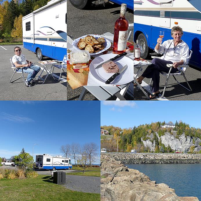 Prochain stop, « la Malbaie »… Le soleil a laissé la place à de vilains nuages noirs. Sur les conseils du bureau d'information touristique de la ville, le sympathique employé nous a indiqué une place pour la nuit, officieuse certes, pas en camping, mais toujours gratuite donc. Un joli parking en bord du fleuve vers un embarcadère. On a eu de la pluie en soirée et dans la nuit mais avec un levé de soleil aux aurores… je ne vous dis pas, enfin si…splendide, ha ça vaut le coup de se lever un peu à l'aube de temps en temps, de toute façon, moi, je retourne toujours dormir après le petit dej … ron ron ron….