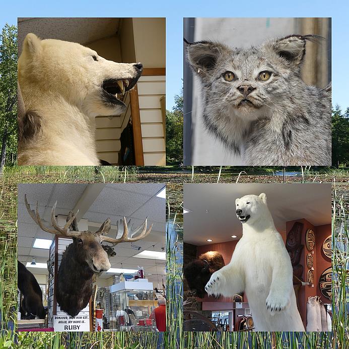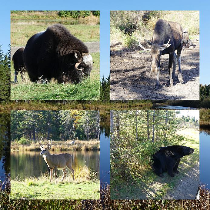 Pour compléter la visite, petite balade d'une heure et 7 kms dans un petit train dont les wagons sont protégés par des grilles, interdit de mettre la main dehors ni de descendre en route, les portes sont bloquées. Pour une fois, ce sont les touristes qui sont les attractions pour les animaux de la réserve qui les regardent passer parfois à moins d'un mètre sans s'émouvoir. Ils ont traversé des forêts, le territoire des animaux du pays, des reconstitutions de villages de trappeurs, de fermes d'époque, c'est là dans la nature en pleine liberté qu'ils ont vu les bisons, les loups (bel espace mais restreint quand même pour la sécurité des autres espèces), les orignaux, les ours noirs, les bœufs musqués, les wapitis, les caribous et plein de jolis chiens de prairie qui ressemblent à deux doigts à nos marmottes … vraiment une belle visite… tout sous la patte, enfin non, sous la main sans avoir à marcher des kilomètres… Moi, je verrai tout ça sur le pc, sans mettre ma peau de chat en danger…