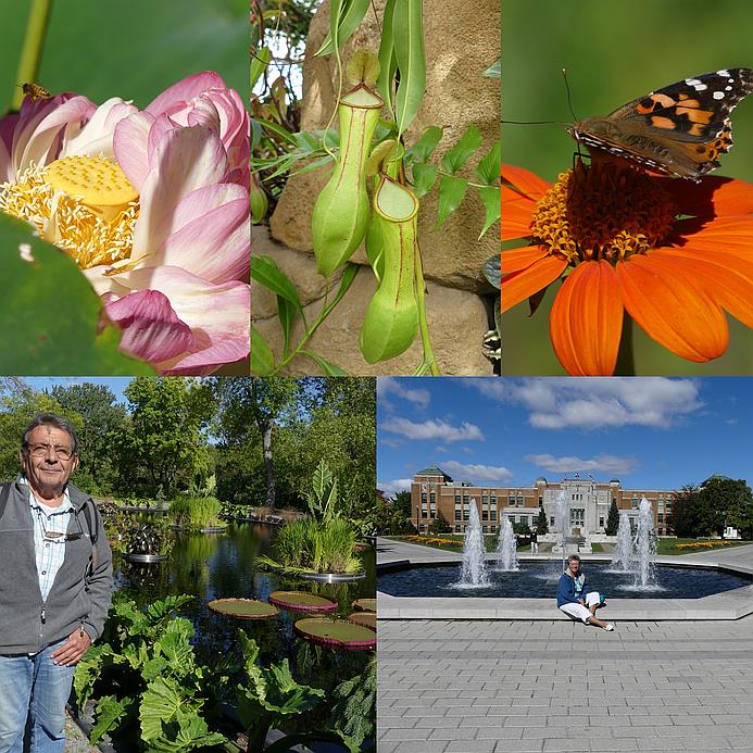 Au programme, le jardin botanique de Montréal, le second plus grand au monde parait-il après celui de Londres… 73 hectares, 22000 espèces, des fleurs, des fruits, des jardins potagers dont les légumes récoltés sont offerts à des associations, un jardin chinois, un jardin japonais, des bonzaïs centenaires, des étangs, un insectarium super intéressant, encore plein de fleurs d'été, des serres exotiques, tout plein d'écureuils qui font leur provision en prévision de l'hiver à venir, des orchidées et aussi de jolies illuminations à la nuit tombée, mais là, je crois qu'ils ont déclaré forfait… ils en avaient plein les pattes… Photos aussi… Ils ont vu le site olympique de l'époque, grandiose… mais vide à cette heure… et encore en travaux…