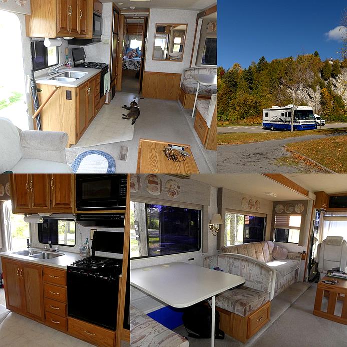 Nous voilà donc de nouveau dans un camping car, un VR ici, Véhicule Récréatif qu'ils disent dans le pays de la poutine. Plus tard chez les américains, (tiens encore un nouveau langage à améliorer, avec leur habitude de mâcher du chewing-gum, ça va me coller aux dents et au palais si je veux avoir le bon accent) donc chez les américains ce sera un RV (et non un VR)...Recreativ vehicul...
