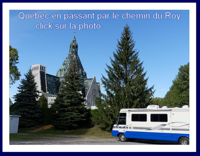 Alors après la visite de Montréal, ils ont pris l'autoroute, « ho, la belle n'autoroute » comme dit le GPS (heureusement qu'on l'a celui-ci car il y a de quoi se perdre, en ville c'est plein d'autoroutes qui se croisent se décroisent, font des noeuds, des boucles, sans compter les travaux dans plein d'endroits – je voudrais pas conduite par ici…). Donc ils sont allés vers l'Est, en direction de Québec, la ville, pas la province puisque c'est là que nous sommes depuis notre arrivée. On a fait une petite halte donc à Trois Rivières dans un terrain appartenant à une institution religieuse qui met à disposition des pèlerins, nous donc … des places pour les camping-cars au bord de la rivière, avec même de l'eau et une place pour vidanger les eaux noires et grises. Le tout pour 15 dollars canadiens la nuit, un peu plus de 10 euros. C'était très joli et les gens qui s'occupaient du site super sympas. Ils nous ont donné plein de tuyaux pour notre prochaine halte à Québec avec leur chouette accent, même qu'il a fallu faire répéter des fois, ils ont aussi dit de prendre l'ancienne route devenue touristique qui longe le fleuve St Laurent, le Chemin du Roy.