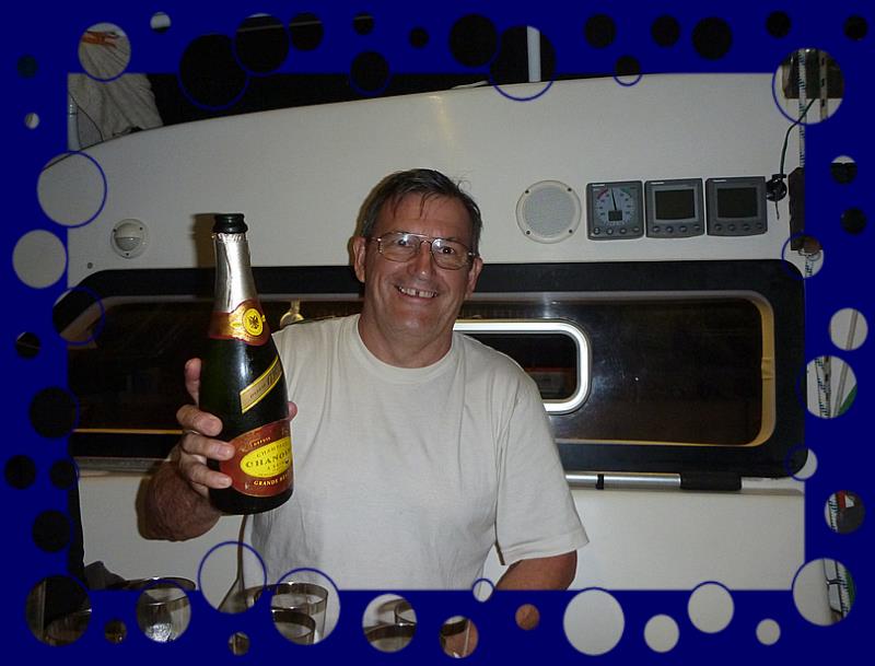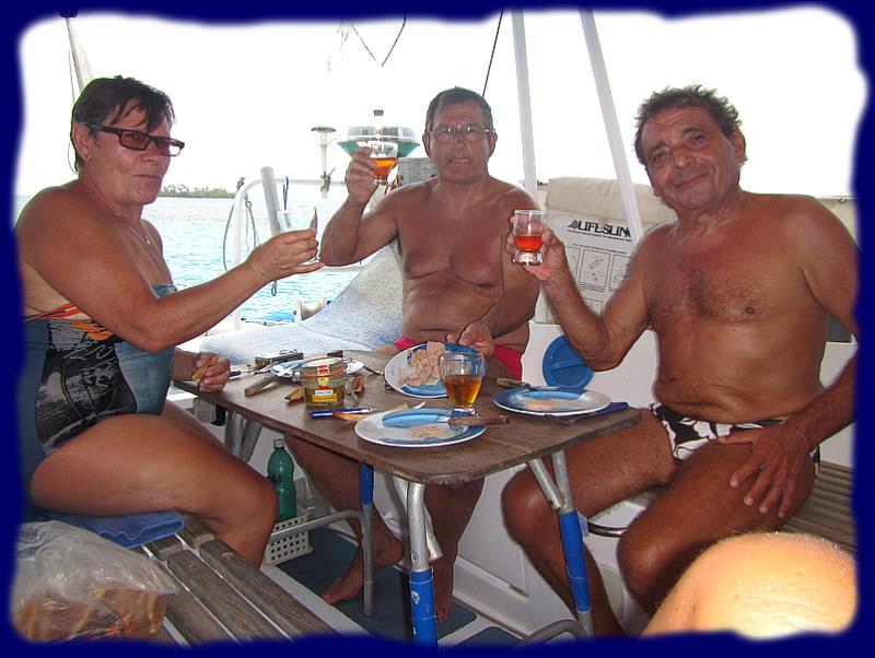 | |  Nous retrouvons Tom et Nadine de Vanille et c'est en leur compagnie et de celle de Goyave que René et Josy arrosent la réservation et l'avenir sur leur nouveau bateau.