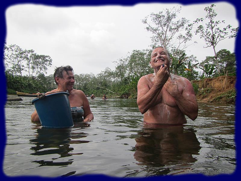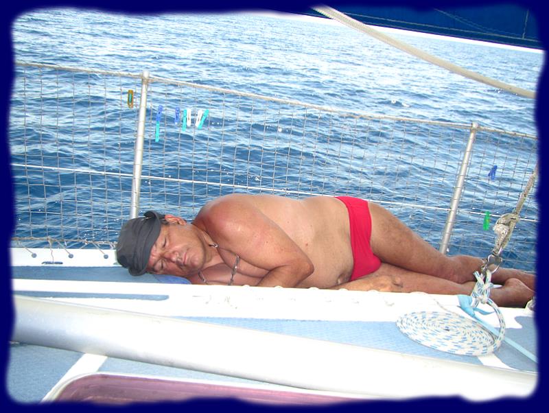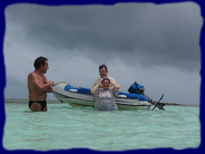 | |  | | On en profite pour faire une petite toilette à l'eau douce et fraîche, rasage y compris ... ce qu'ils ne savent pas encore, c'est qu'en sortant du Rio pour rejoindre le bateau, il faut passer la "barre" et qu'en général, c'est l'occasion de se remouiller à ... l'eau de mer ... |