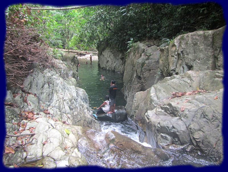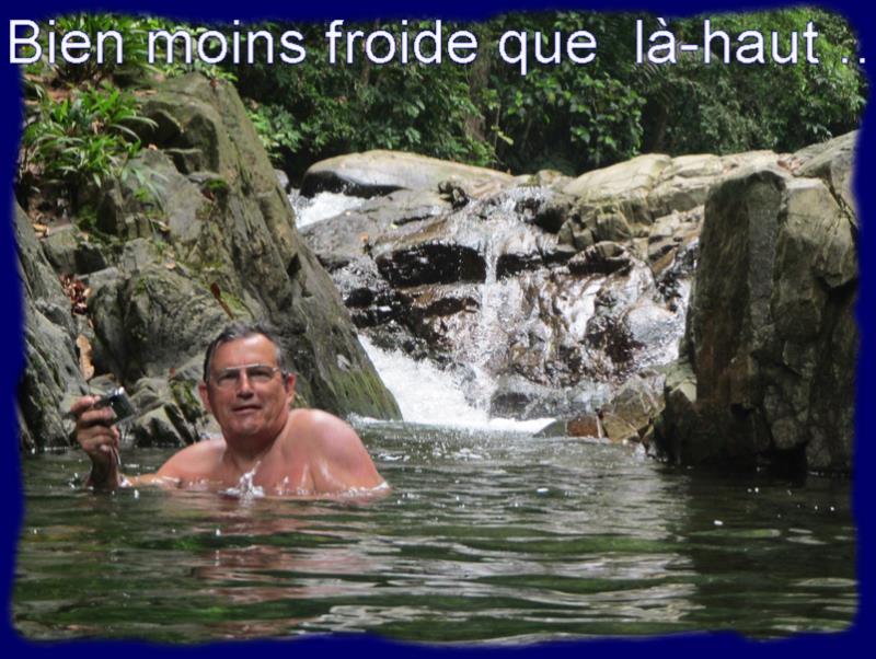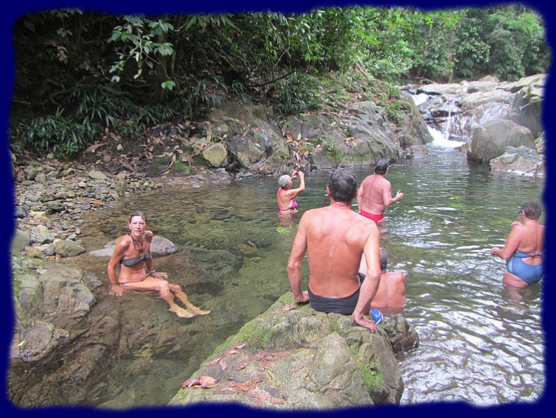 Nous poursuivons notre petit bonhomme de chemin jusqu'à la cascade où nous ferons une trempette revigorante. Les téméraires se jettent à l'eau depuis les rochers en surplomb. |