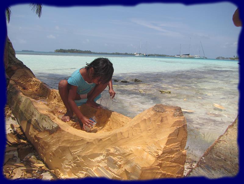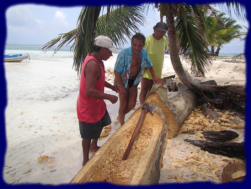 A Banedup, ce sympathique kuna construit son cayuco dans un tronc échoué lors d'une tempête, la matière première est livrée par la mer ... voilà un arbre que l'on aurait pas aimé rencontré au large ... d'où vient-il ? mystère ... peut-être de la Magdalena en Colombie quand celle-ci se déchaîne aux périodes des fortes pluies ... "Dieu" seul le sait, toujours est-il que le bonhomme a un sacré coup de main avec pour seuls outils, une sorte de hache et une petite herminette ... nous lui prêtons une pierre à affûter qu'il nous rend quand nous quittons son île. Il lui faut une petite semaine pour terminer son oeuvre. |