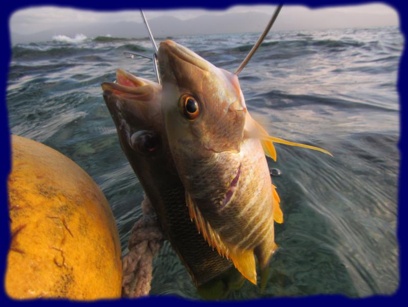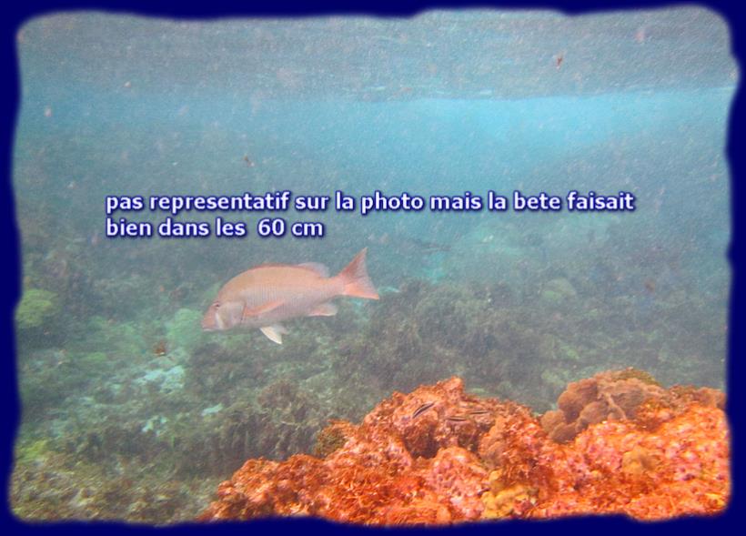 Le moussaillon (moi, donc, je n'ai pas pris beaucoup de grade pendant toutes ces années!) indique un groupe de pagres, mais pas facile aux chasseurs de viser juste avec le courant. Un magnifique vivaneau ou un pagre rose sera aussi l'objet de convoitises, mais il sera aussi gracié, un énorme baracuda me passe juste à coté, pareil, il continue son chemin dans être inquiété par les flèches ... les poissons sont plus à l'aise dans leur élément que nous, surtout dans ses conditions difficiles. Enfin, cela aura été l'occasion d'un bon exercice physique. |  |