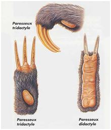 Cette distinction n'est valable que pour les pattes antérieures car tous les paresseux ont trois orteils aux pattes postérieures. |