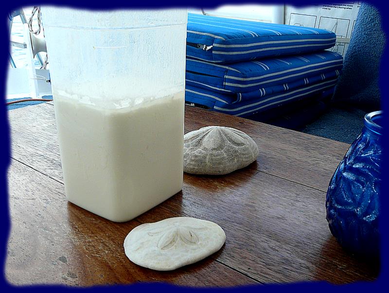 Fabrication de fromage blanc à bord ... 3 cuillères à soupe de lait en poudre, un peu d'eau et une "mère" de la fois d'avant... 36 heures de pose et vous obtenez un délicieux fromage frais, à agrémenter selon vos goûts. spécialité du moussaillon ... avec les yaourts, les flans aux oeufs, et quelques petites gourmandises. |