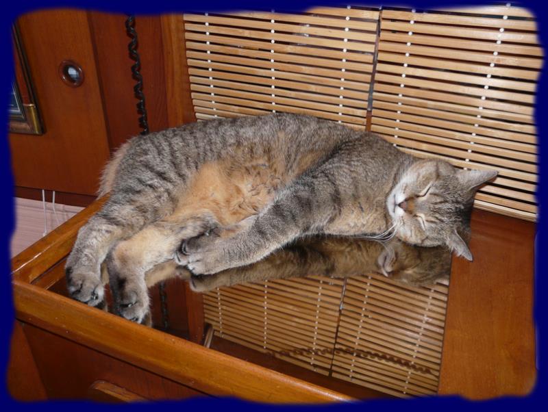 Il nous reste un assez grand miroir de chez Ikea non utilisé à bord. Nous l'avons proposé ces derniers temps à une navigatrice qui fait quelques jolis bijoux mais comme il était trop grand pour elle, ce miroir est revenu à bord. Ni une, ni deux, Florentine a eu l'occasion de l'apprécier pour en faire son nouveau couchage . Je viens de lui installer et cela lui permet, hormis de s'y mirer, d'y être au frais. Un peu Narcisse notre Ro Minet ...