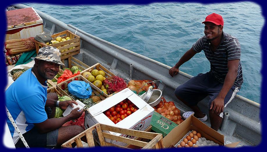 Appros dans les îles, fruits et légumes frais, un peu de poulet et parfois un peu de vin en brique et très occasionnellement du lait.