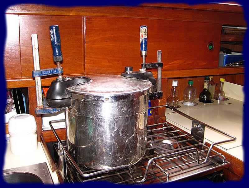 | | Quand les langoustes ou autres bestioles style cigales de mer ou crabes sont trop gros, nous sommes obligés d'emprunter la cocote des Jilou mais comme le joint est un peu mort, le Cap'taine a trouvé une parade ... |