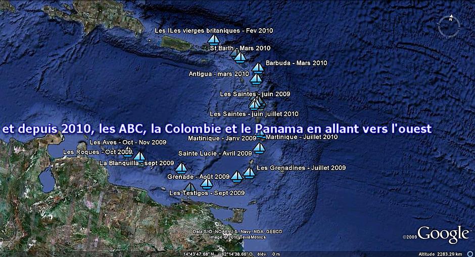 La Martinique, arrivée janv 2009 Sainte-Lucie, La Guadeloupe, et les Saintes La Dominique, Les Grenadines, Grenade Les îles du Vénézuéla (fin 2009) remontée sur Saint-Martin Les BVI, îles vierges britanniques (février 2010) St-Barth Barbuda et Antigua ... la Guadeloupe édition 2010 Marie-Galante et les Saintes La Martinique et Ste Lucie 2010 Evidemment les Grenadines ... édition 2010 Cariacou pour caréner Chamicha puis Grenade Les iles de Vénézuéla et les ABC pour la saison 2011 La Colombie en coup de vent fin 2011 et ENFIN notre arrivée au Panama début 2012 |