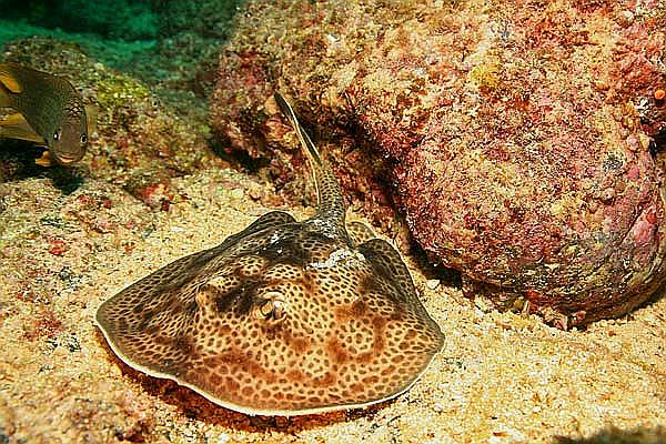 La raie-aigle tachetée (Aetobatus narinari) est l'une des plus belles raies-aigles. Elle reste en principe sur le fond mais on peut parfois l'observer " voler " en ondulant à la manière d'une hirondelle.