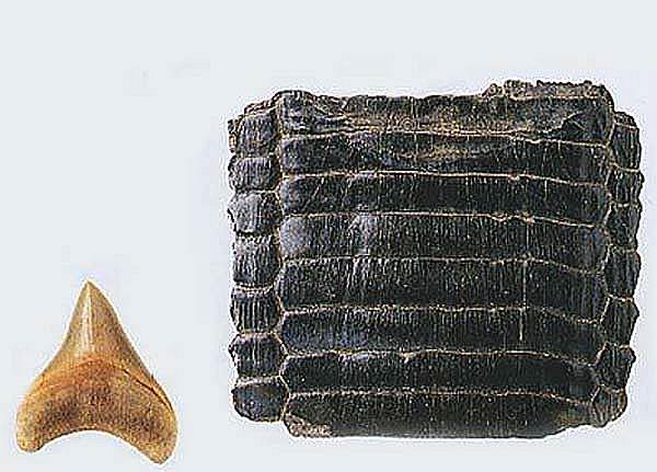 | | Comparatif entre une dent de carcharocles et un pavé dentaire de la raie Myliobatis . (Montage effectué avec 2 photos prises dans des musées 1998 ) |
