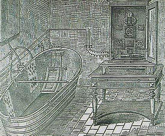 L'électricité était introduite par deux électrodes dans le corps du patient étendu dans la baignoire |